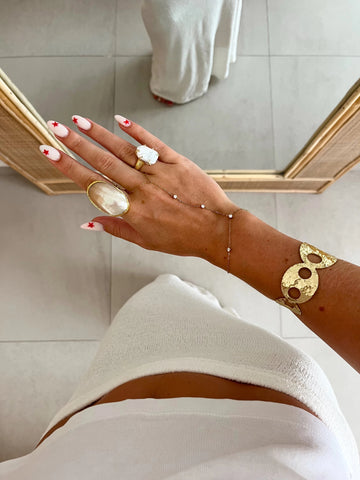 The cool hands stack contains the mar ring, julie ring, ilse handchain, and georg bracelet.